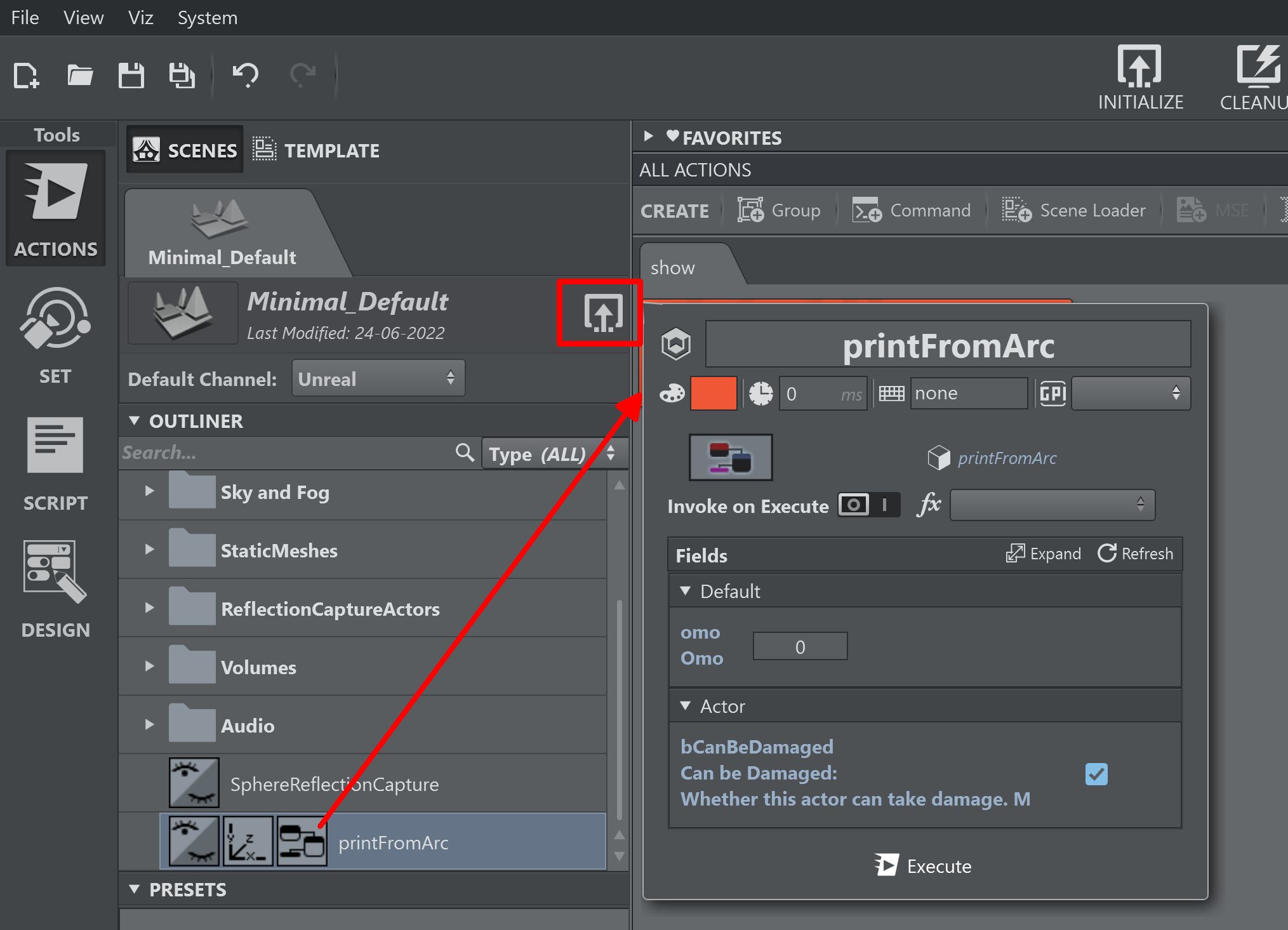 Open the Blueprint by clicking on the Edit printFromArc link in the Outliner view. Create a new variable and rename it to omo and set the type to Integer.