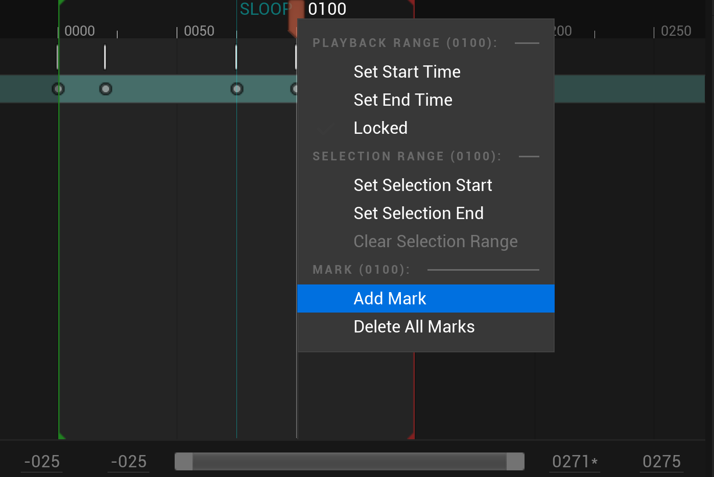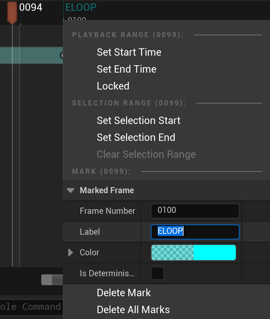 A Mark can be set on the unreal sequencer editor by right clicking the timeline and selecting Add Mark or in case a marker already exists, its label and position can be modified.