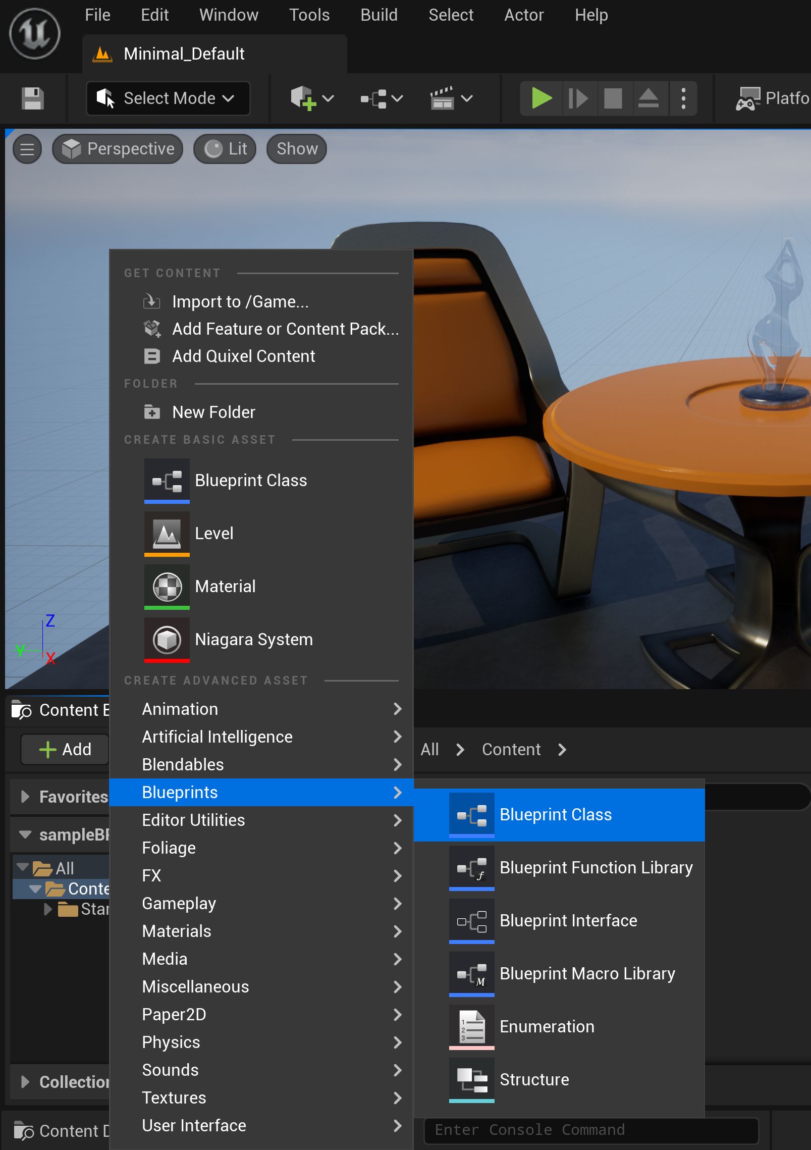 First, add a Blueprint Class to the project content by clicking the Add button in the Content Browser view, select Blueprints and then Blueprint Class.