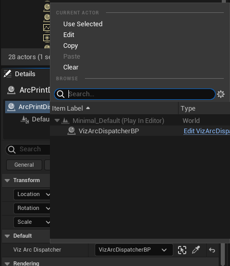 Drag the Viz Arc Dispatcher BP to your level (create actor).