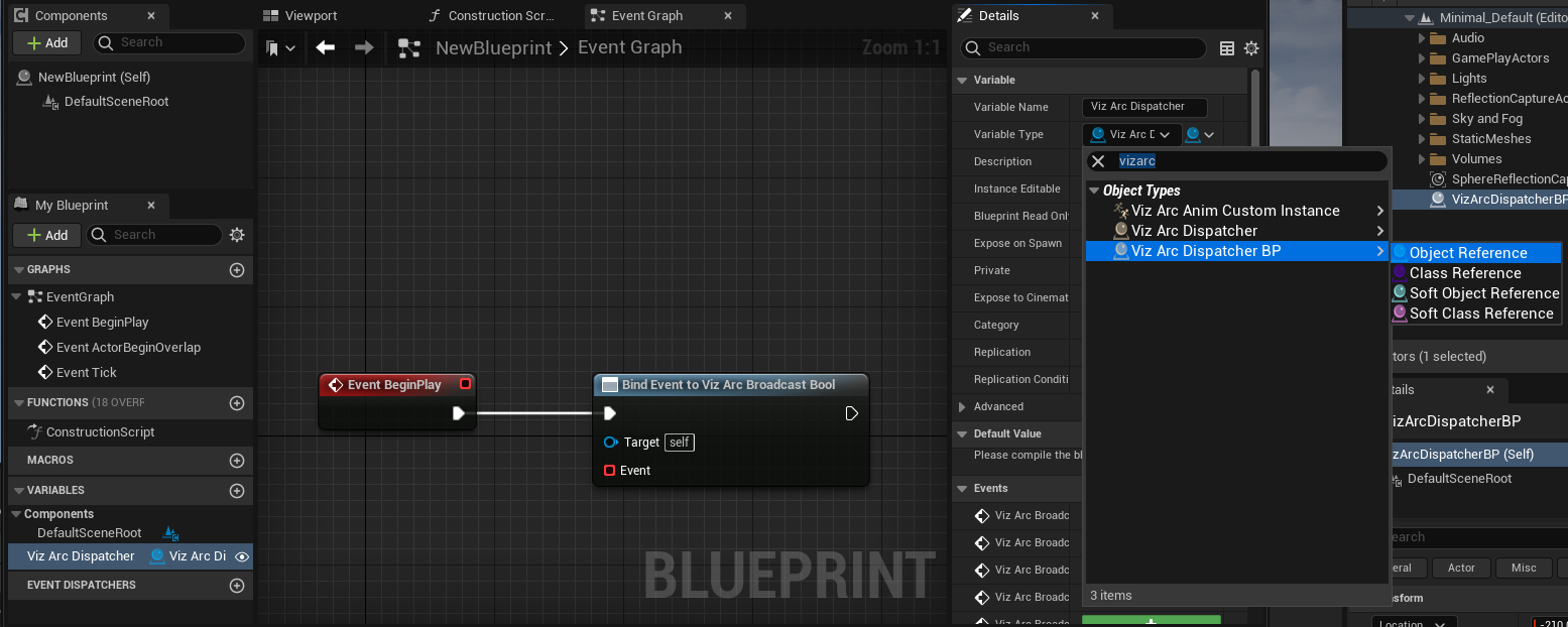 Open or create the Blueprint that is to subscribe to the Viz Arc dispatcher.