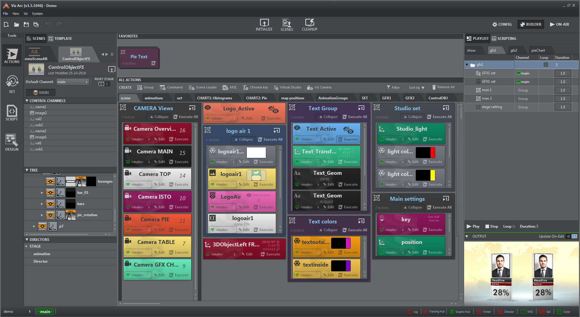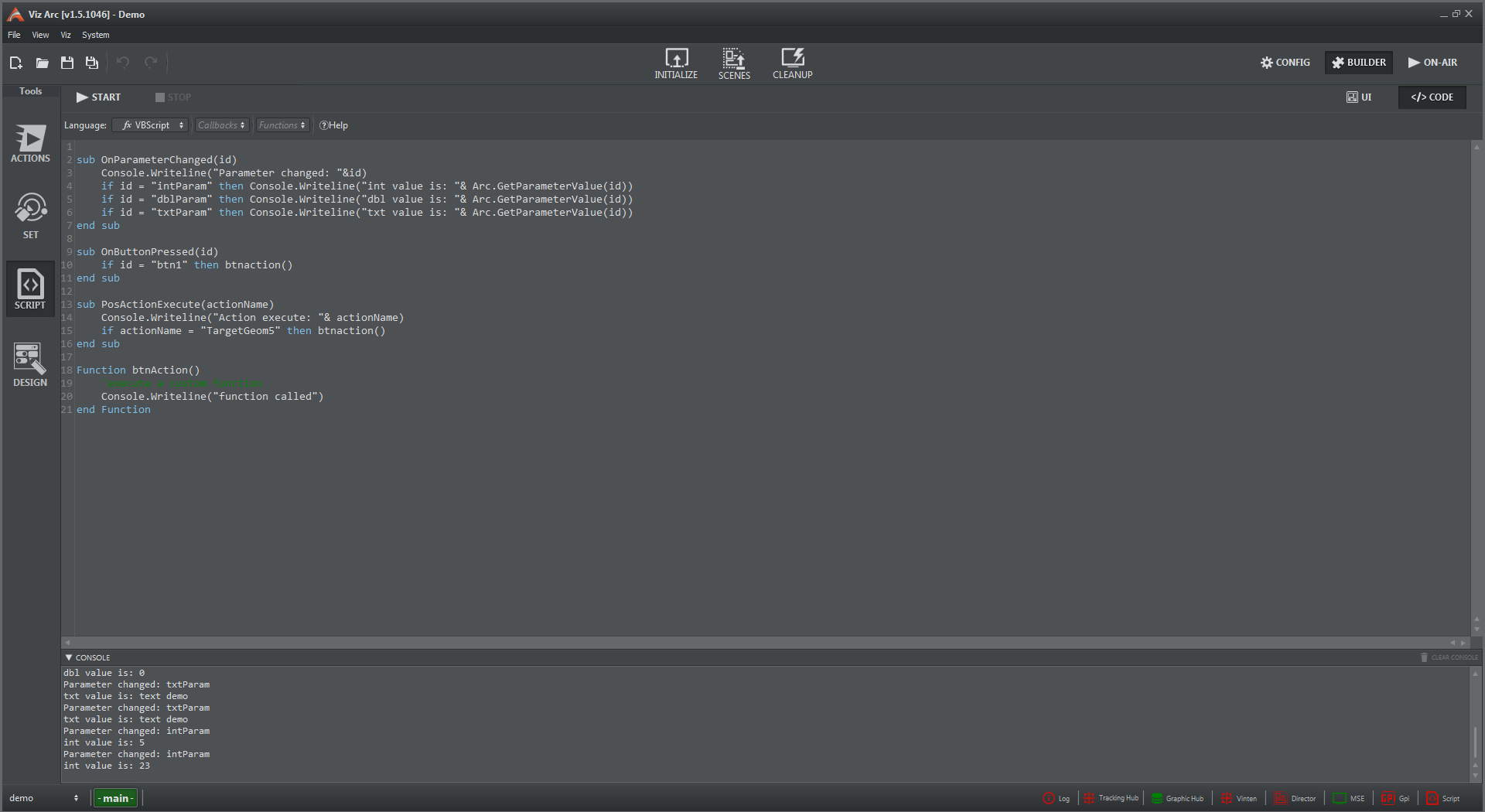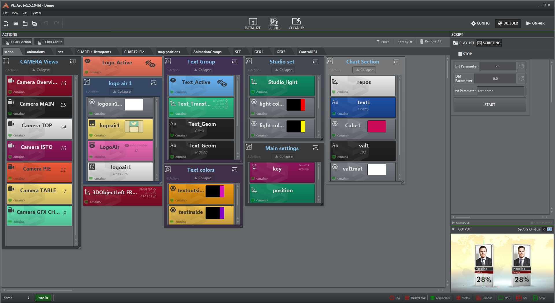 Viz Arc includes a built-in scripting engine for connecting to a database or granting additional control to operators. Custom scripts can be written from this section of the interface. Scripts can include form elements such as text boxes, buttons, etc. that are available to users from the Actions panel or when working in On Air mode.