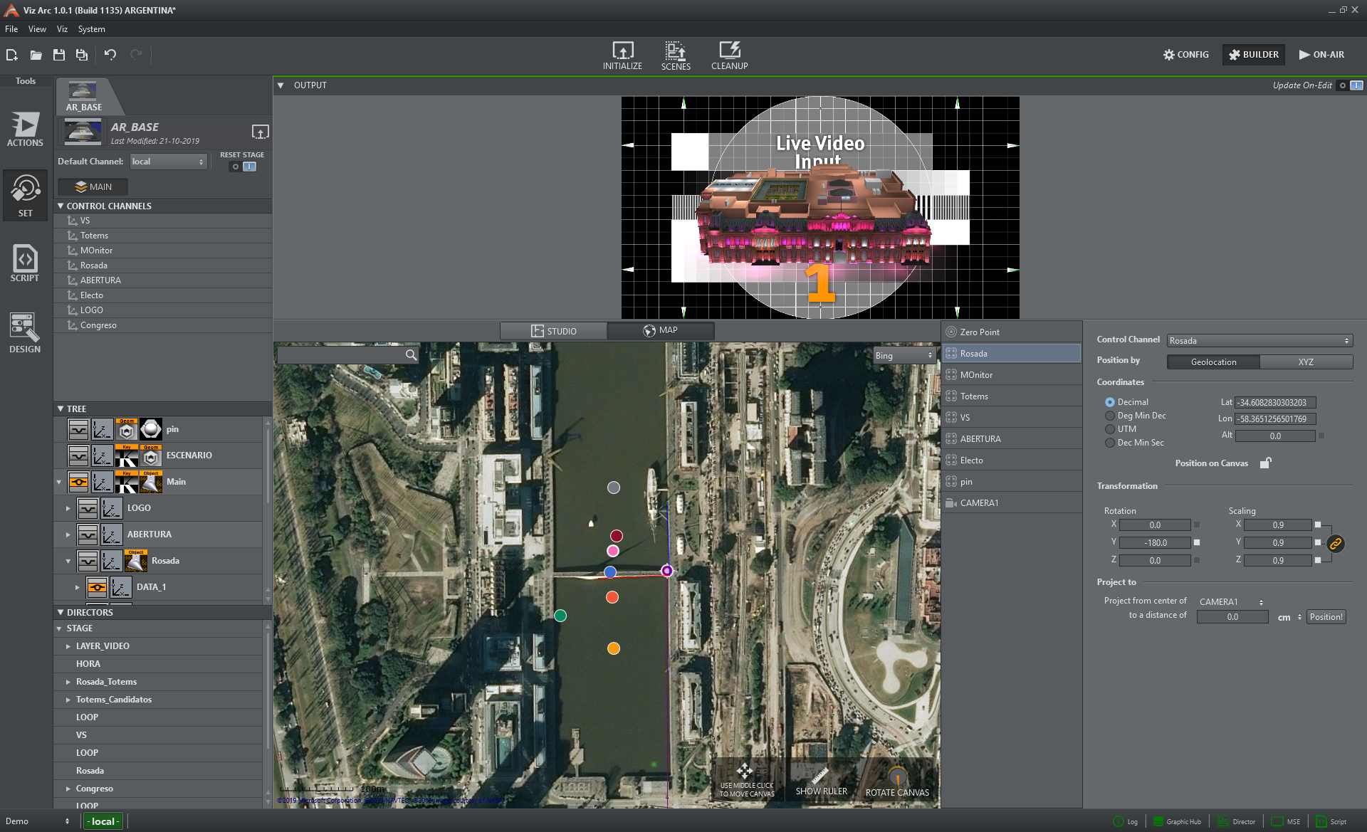 One of the key features of Viz Arc is the ability to configure all your virtual studio and augmented reality elements' positions in relation to your physical environment and tracked cameras. For indoor productions, you can import an AutoCAD project (.dxf) to set up the different elements or work over a map when outdoors.