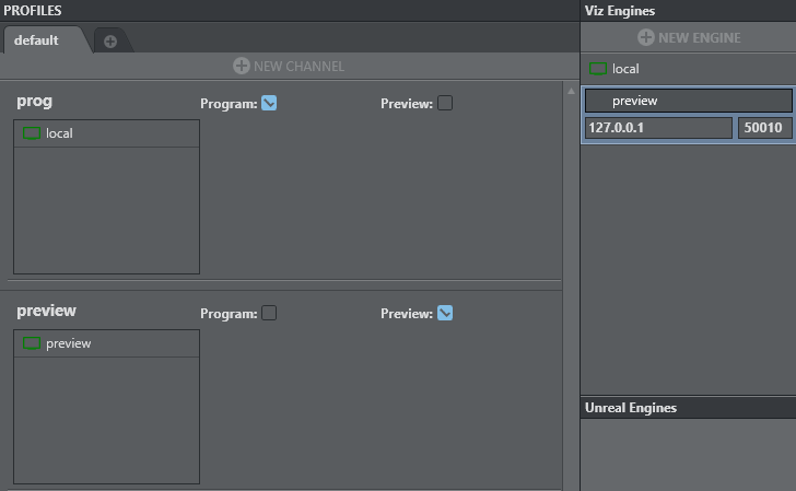 To configure still preview, configure a dedicated Channel in the Profiles section and tag it as Preview Channel. The communication port must be configured to match the Viz Engine's still preview port, which is by default 50010. A still preview configuration example is shown below: