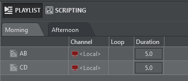 { "duration": 10.0, "index": 0, "name": "Morning", "rows": [ { "actionUUID": "b78801bd-c802-42dd-ae11-9955c53dbfe3", "duration": 5.0, "id": "17a6ee8d-8c82-4480-9bda-32e4b9447336", "name": "AB" }, { "actionUUID": "6dd3107a-9487-4f32-92a0-b7eb83a1328f", "duration": 5.0, "id": "4580c837-69a9-41b4-95dc-29b05f1ae0d4", "name": "CD" } ]}Starting from index 0 this call returns a single playlist tab only.