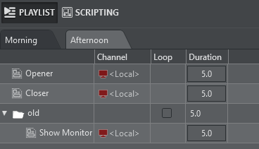 [ { "duration": 10.0, "index": 0, "name": "Morning", "rows": [ { "actionUUID": "b78801bd-c802-42dd-ae11-9955c53dbfe3", "duration": 5.0, "id": "aaf0b451-1bb6-4bae-b11d-3b0c5f552e36", "name": "AB" }, { "actionUUID": "6dd3107a-9487-4f32-92a0-b7eb83a1328f", "duration": 5.0, "id": "58b51c71-a904-4c95-b5d8-f42184af025e", "name": "CD" } ] }, { "duration": 15.0, "index": 1, "name": "Afternoon", "rows": [ { "actionUUID": "27cc7a3b-6f90-4d88-9101-a356a1668d83", "duration": 5.0, "id": "7f284bd1-a727-4e26-aea8-f417010c5386", "name": "Opener" }, { "actionUUID": "955a622a-862b-4206-9658-a48b0c9f9a7e", "duration": 5.0, "id": "f43b4470-d08c-4261-8fb2-58ef97c4db28", "name": "Closer" }, { "duration": 5.0, "id": "483231c0-5484-478c-9bbc-74530dafa7cd", "loop": false, "name": "old", "rows": [ { "actionUUID": "ae7d2e75-552f-40e7-8c3d-7a8ef716809a", "duration": 5.0, "id": "c542f3d4-53d3-4aa1-82d1-8e75ae86342b", "name": "Show Monitor" } ] } ] }]The GET method returns all Playlist tabs and their respective rows and folders.