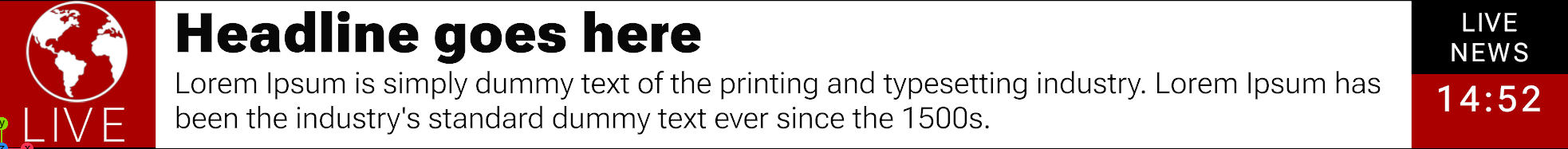 Lets continue with the more complex lower third banner. This element can be split into three sections. A live badge on the left side, a centered part that shows a headline and some more information text and on the right side, we will have again a tile part and a live clock.