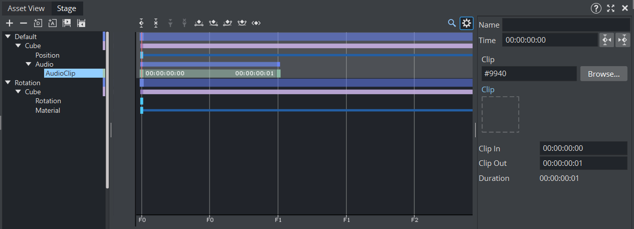Switch to the Server/Stage view and drag an audio clip from the Server Panel onto the Clip drop zone in the object editor.