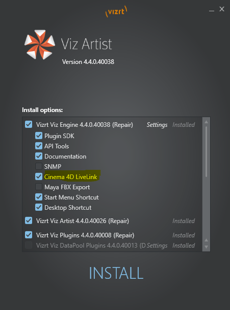 Start the Viz Artist installer again and select Repair mode. This makes a copy of the LiveLink files to the CINEMA 4D plug-in folder.