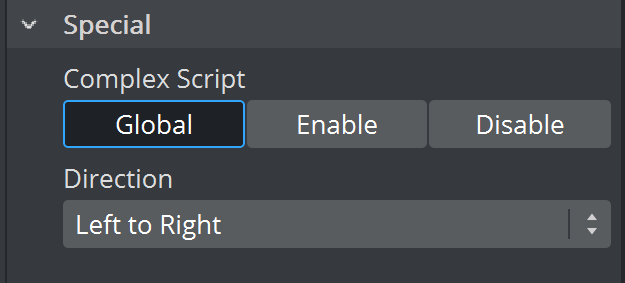 • Complex Script: Enabling Complex Script allows usage of advanced typographical features including, but not limited to, font ligature (important for many Asian scripts and handwriting fonts), right to left and bi-directional writing, special symbols and Unicode emojis. You can Enable or Disable this feature on a per-text basis using this option, or select Global to use the globally set configuration. Global is selected by default.