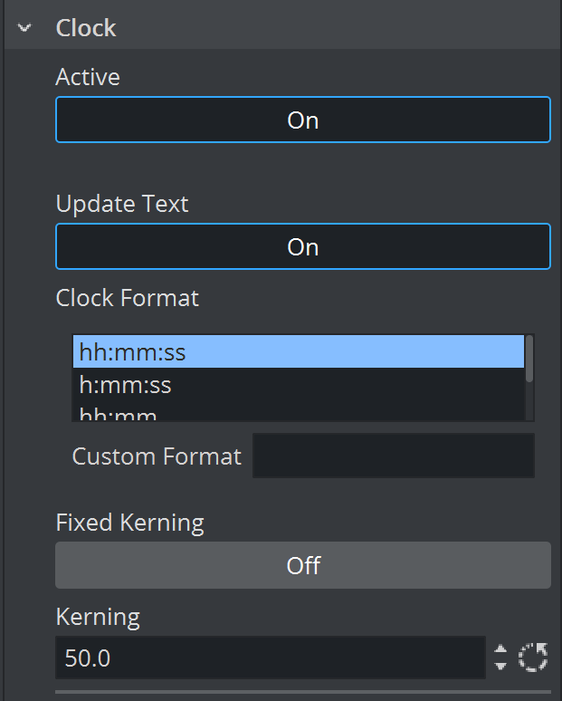 Click the Clock tab in the Text Editor to open the Clock panel. In the Clock panel, the display of a clock can be inserted and edited. Click the small switch in the upper left corner of the panel to enable the clock. The clock is added to the text string, if any, at the cursor position.