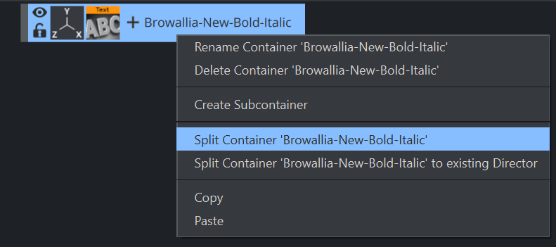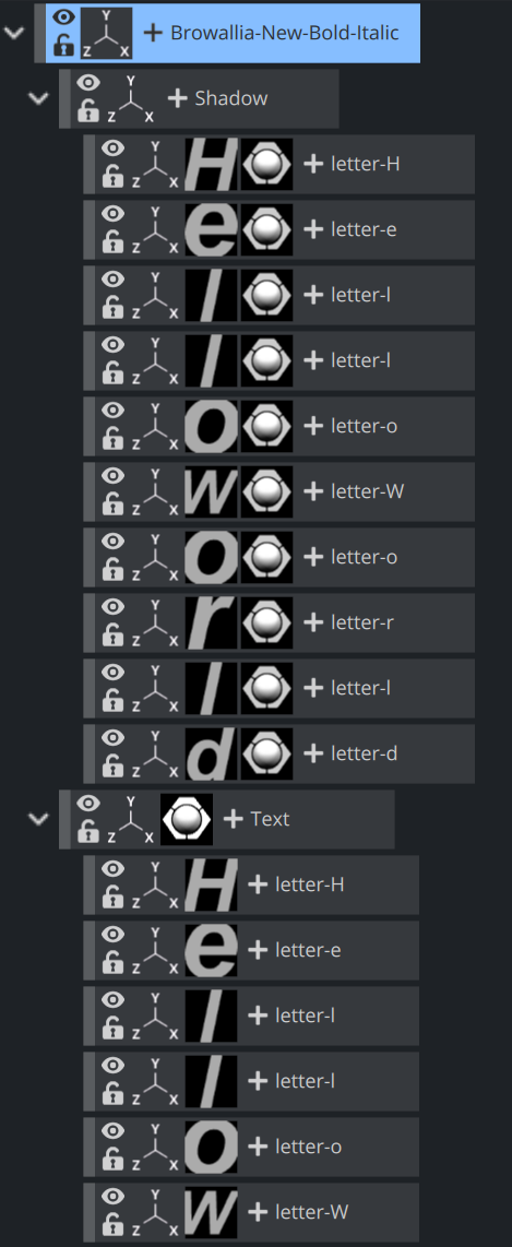 • Geometry: When adding a geometry font, the text is treated like a compound object created from characters. The text can be split to become a group of single character objects (not text!). Splitting of text makes it possible to edit the properties of single character objects. If a Drop shadow had been assigned ot the text, it is put into a separate container.