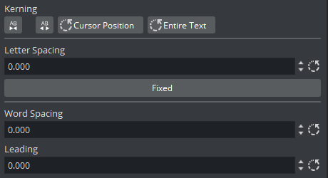 • Kerning: Set custom kerning between the characters at the current cursor position. This can also be done by using the ALT key and cursor left and right. This property can be reset for the current cursor position or the entire text using the corresponding reset button.