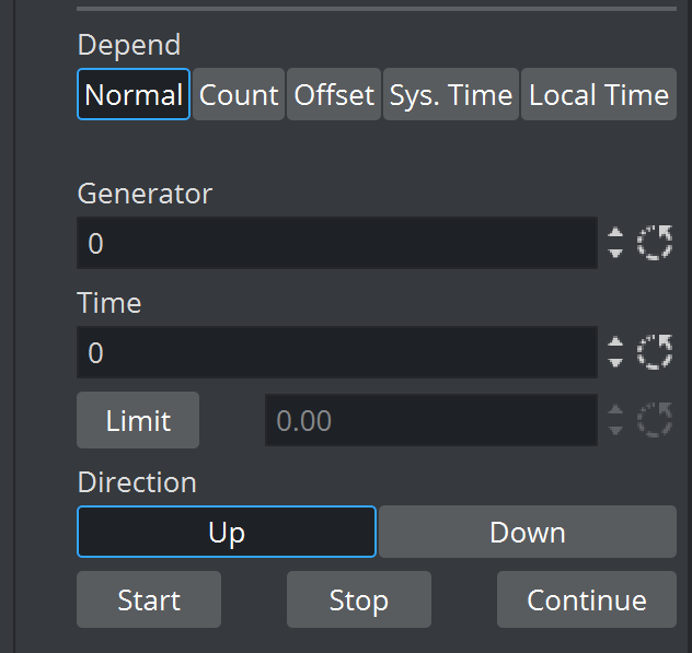 • Limit: (Normal/Offset) Defines the count limit in seconds. For example, if the clock should stop counting after two minutes, set Limit to 120.