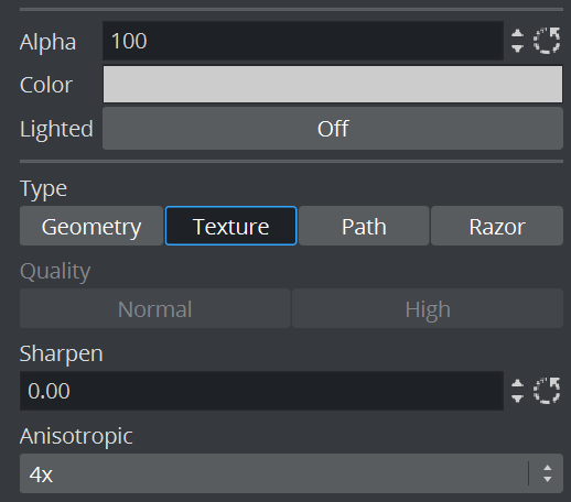 • Anisotropic: Improves the texture sampling for anisotropic (in this case non-square) pixel filter areas in mipmapping mode, for example a rotated text texture. Choose either to use the standard mipmap level selection, or select the anisotropic filter rate from a number of available settings. Higher values give better image quality at the expense of some performance. The default value for anisotropic filtering is 4X. This option is only available if font type is set to Texture.