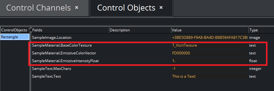 Set the Value of the corresponding fields of the control object to an Unreal VizrtTexture name, a vector (in the form of a packed integer) and a float.