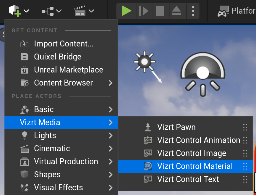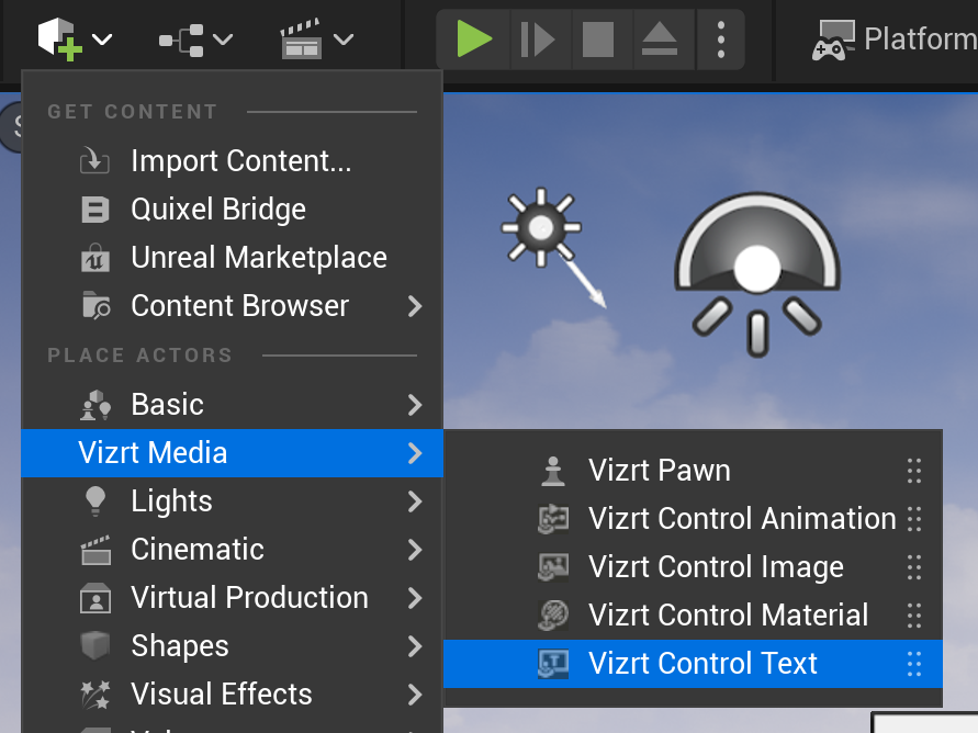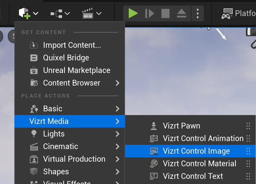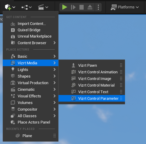 In Unreal Engine, add a Vizrt Control Parameter actor to the world.
