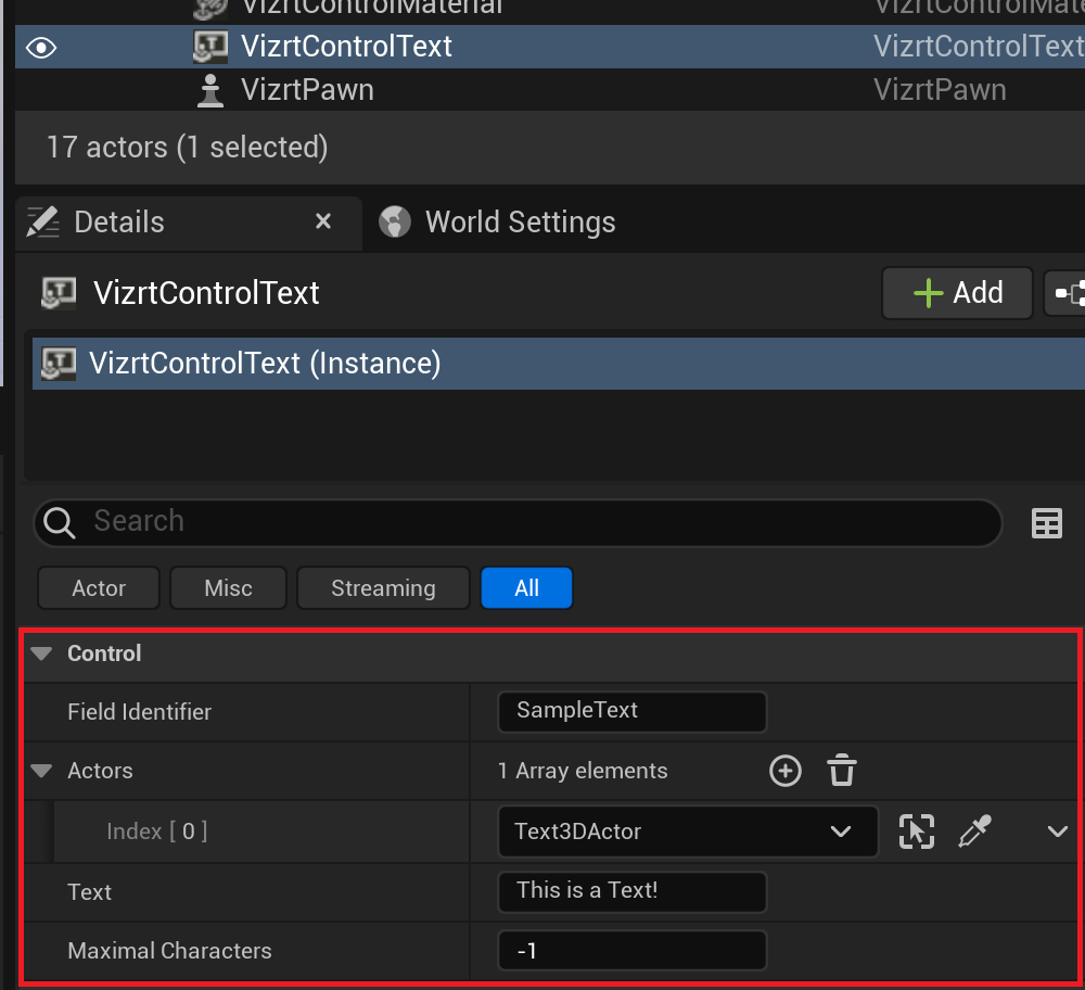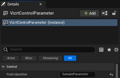 Select the newly created VizrtControlParameter actor and go to the Details panel.