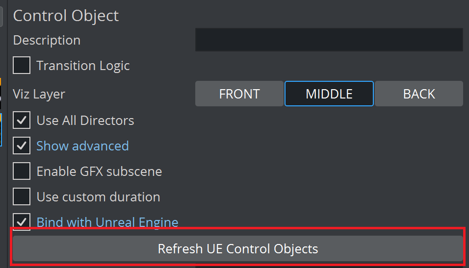The control object for the Unreal ControlMaterial is shown. If not, click the Refresh UE Control Objects button in the Control Object plug-in.