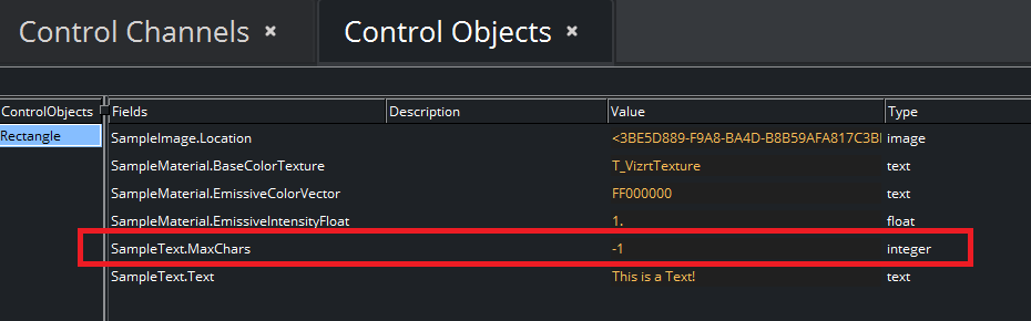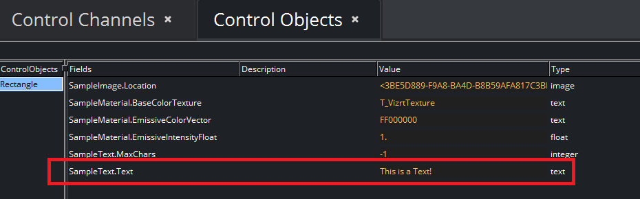 In Control > Field Identifier set a name. This identifies the control object Field name in Viz Engine.