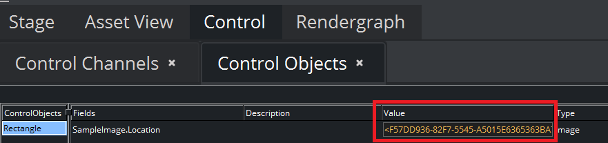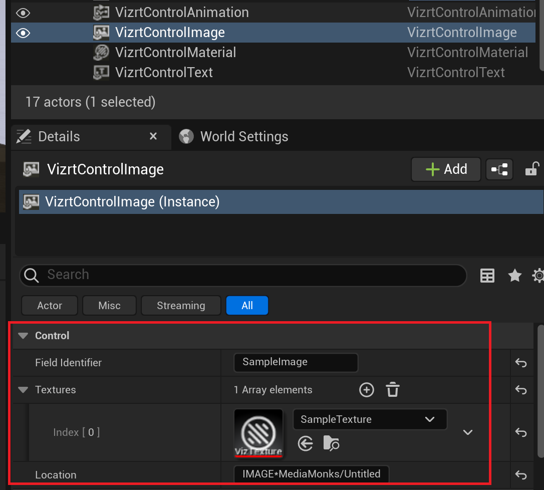 In Control > Field Identifier set a name. This identifies the control object Field name in Viz Engine. In Control > Textures add the VizrtTexture created before. Its Control > Location property receives the image location from the Viz Engine Control object.
