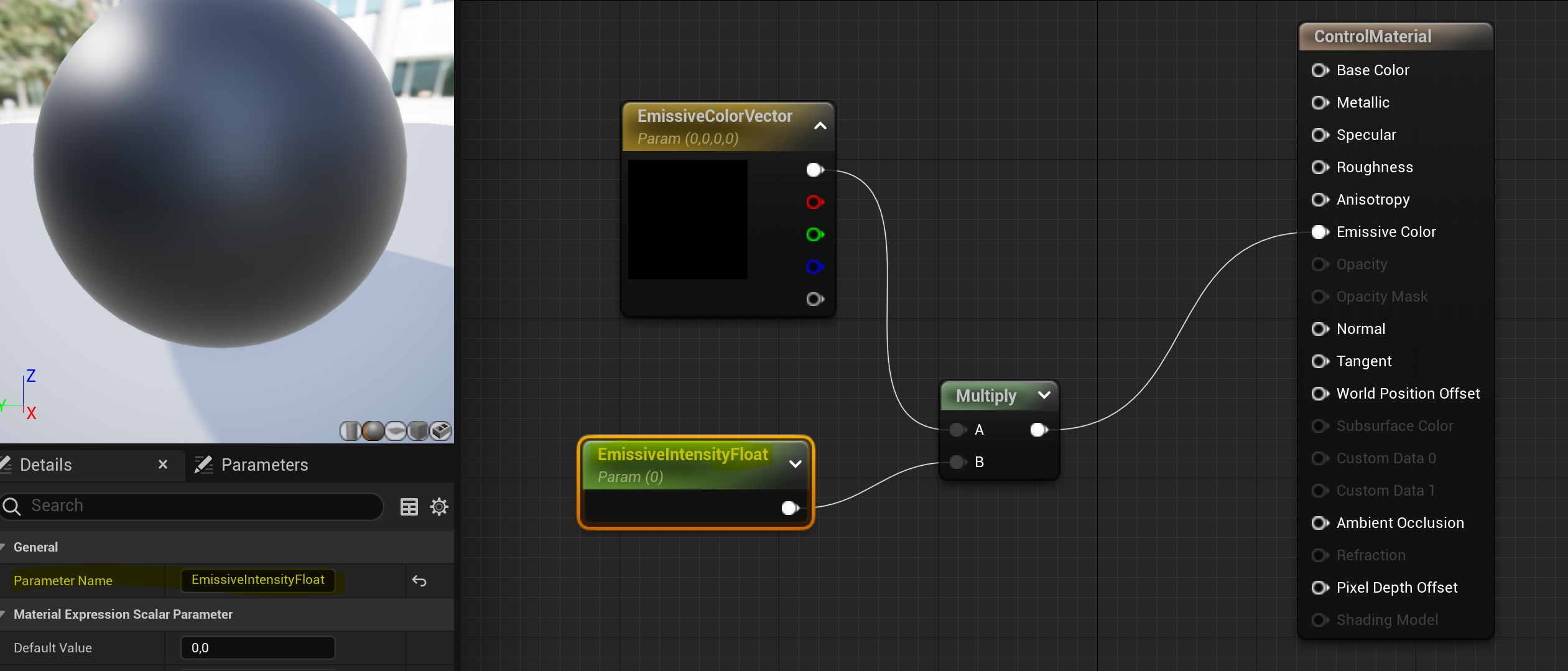 Rename the parameter to match the Texture Parameter specified above. In this case, it was named EmissiveIntensityFloat. Drag the output node of the parameter and connect it to the rest of the graph. In this case it is connected to a Multiply node that scales the intensity of the emissive color parameter.