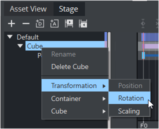 In the menu that shows, click Transformation > Rotation. A rotation channel and two Key Frames are added.