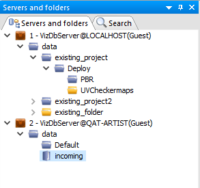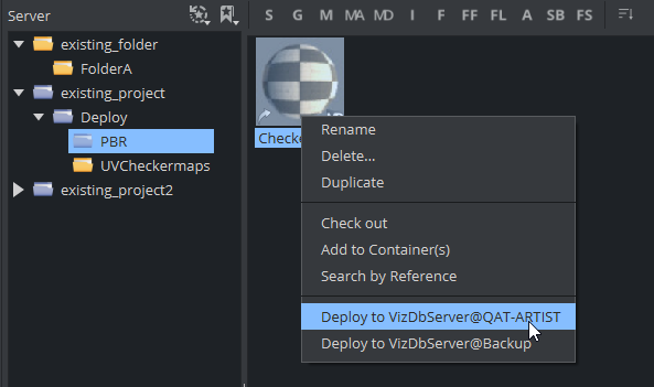 A PBR Material (from data\existing_project\Deploy\PBR) is deployed from Server A (localhost) to Server B (QAT-ARTIST). Project existing_project is set as Source UUID and incoming is set as Target UUID in deploy configuration. The Material itself has a reference to a texture in folder UVCheckermaps and has itself a folderlink to UVCheckermaps. From within Asset view, right click on the item you need to deploy and select Deploy to Target.