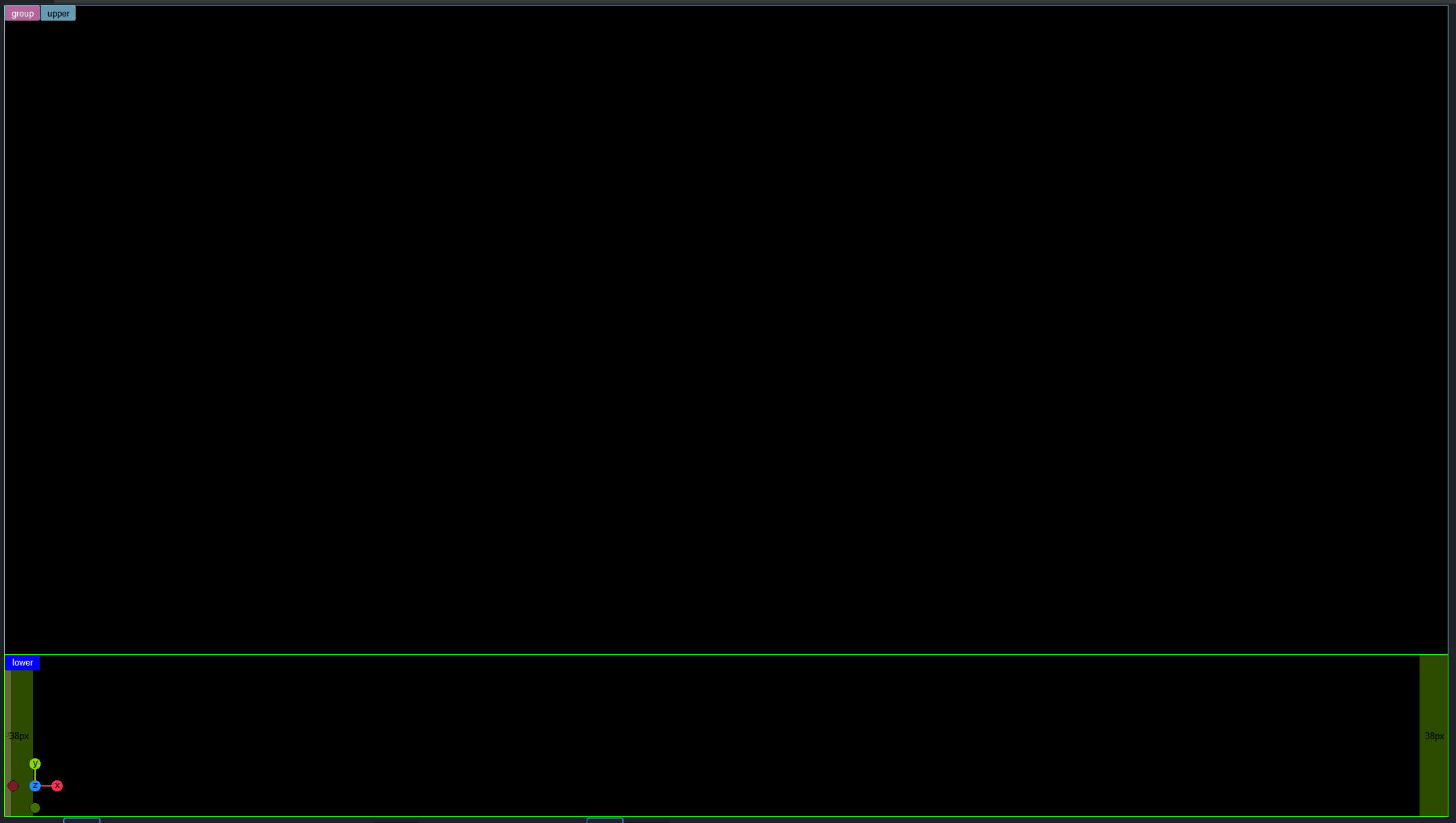 Create the main container and two Subcontainer representing the Upper and the Lower part. In our default format (16:9 HD resolution), the lower takes 20% of the whole height. The top container (group) has a width and height of 100% to fill the whole screen and the Flex direction is set to be column. This aligns the upper on top of the lower. The lower container is set to height of 20%, and Grow and Shrink set to 0. This ensures that the lower always has a fixed size of 20% of the whole screen. It also has a padding on left and right set to 2%. The upper container gets a height to 100% (or auto) and Shrink set to 1. This allows to shrink to the remaining space of 80% in height.