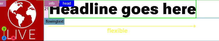 In the flexbox properties of the head container, set Grow and Shrink to 0, Width and Height to Auto. In addition, set all margins (expect left) to Auto. The left margin now controls the distance/offset of our headline text to the left Live Badge. You'll notice that the textbox now grows and shrinks correctly according to the amount of text being entered. If we would have kept the geometry aware scaling, the text can be sized down if it gets too large.