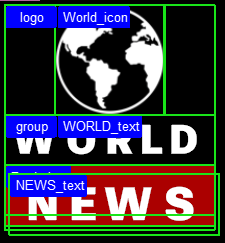 Change the width of the World_icon to get bigger (100%). The NEWS_text container can be adjusted by simply modifying the Left and Top Offsets. You can use pixel values or %.