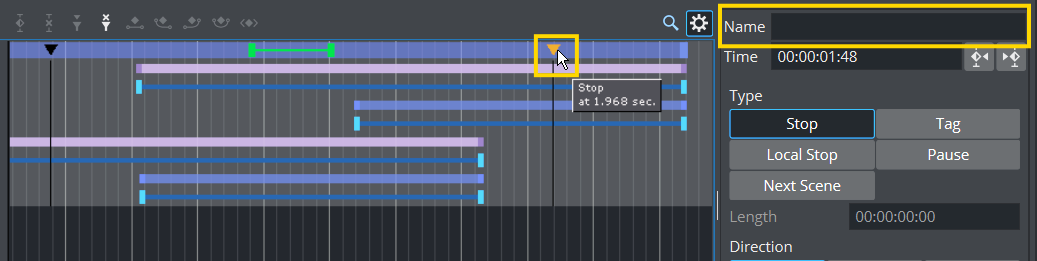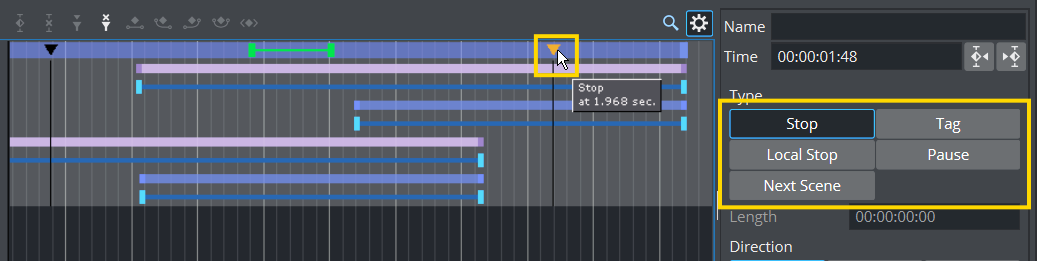 Local Stop: Stops the animation until continue animation is clicked. A local stop only applies for the Director it is placed on, not its Sub-Directors.