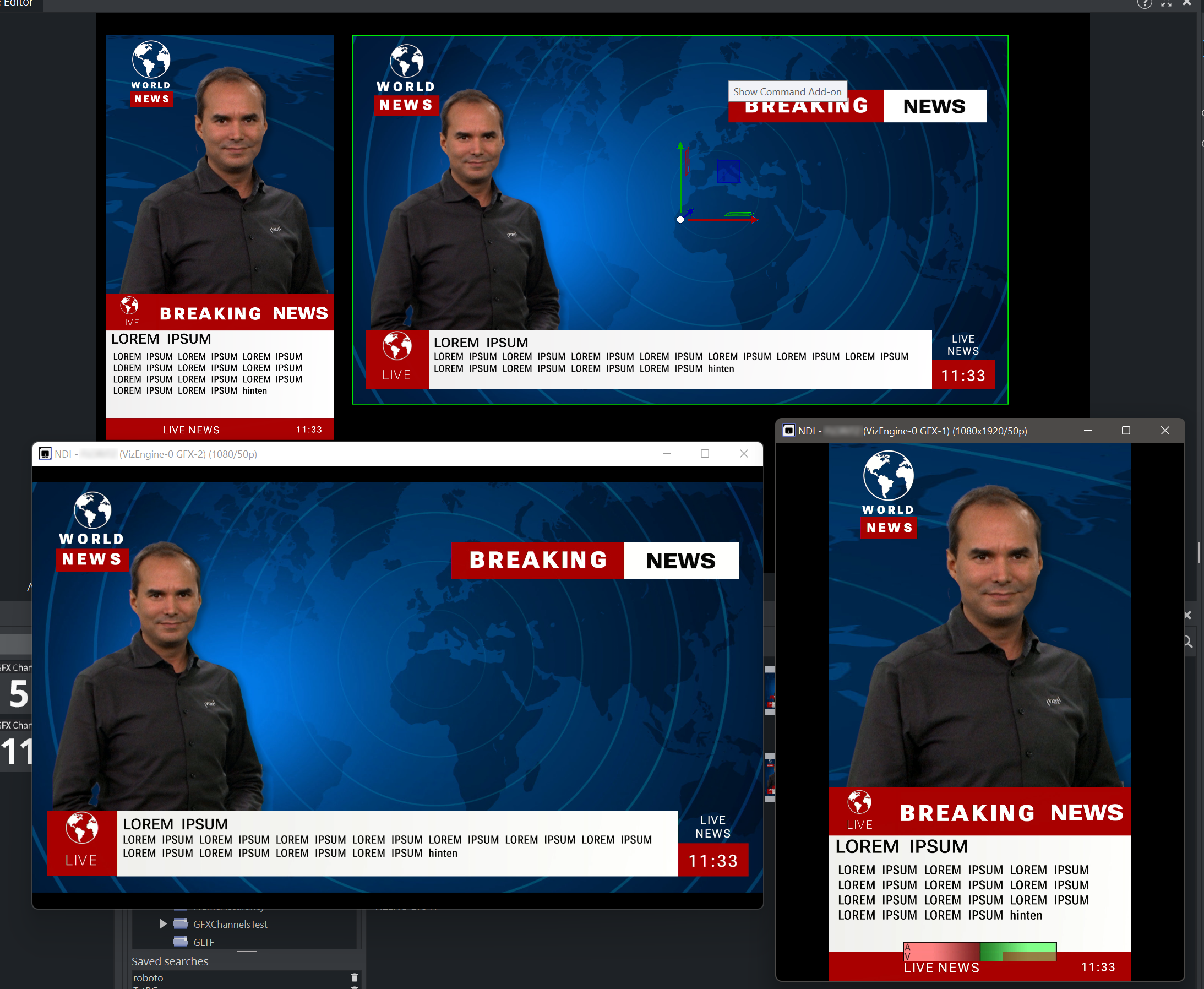 To support multiple outputs, the content of any GFX channel can also be broadcasted into an NDI network. The name of the NDI stream is then <engine-instancename> GFX-n (for example, VizEngine-0 GFX-1).