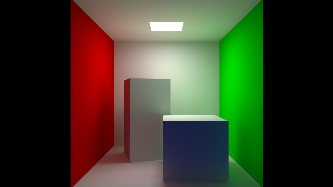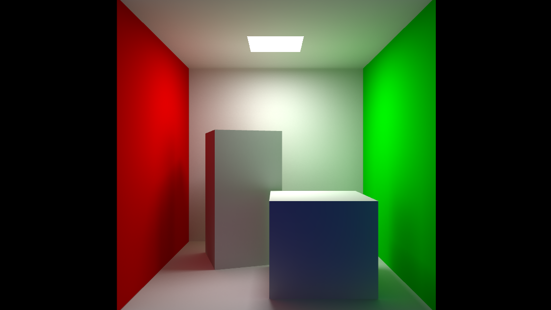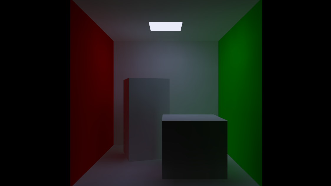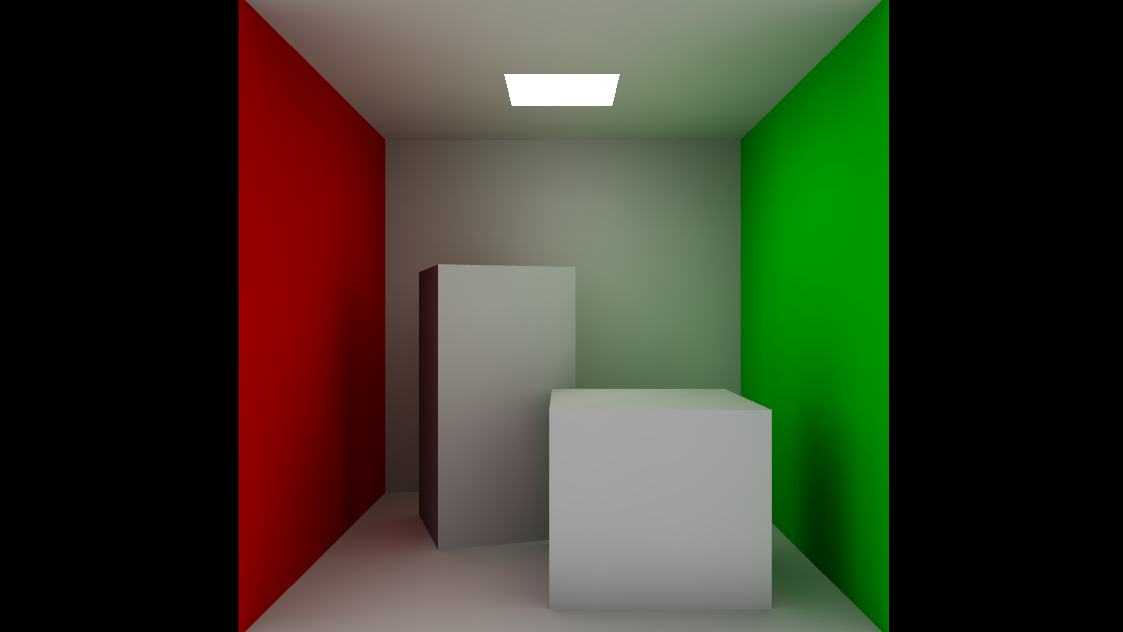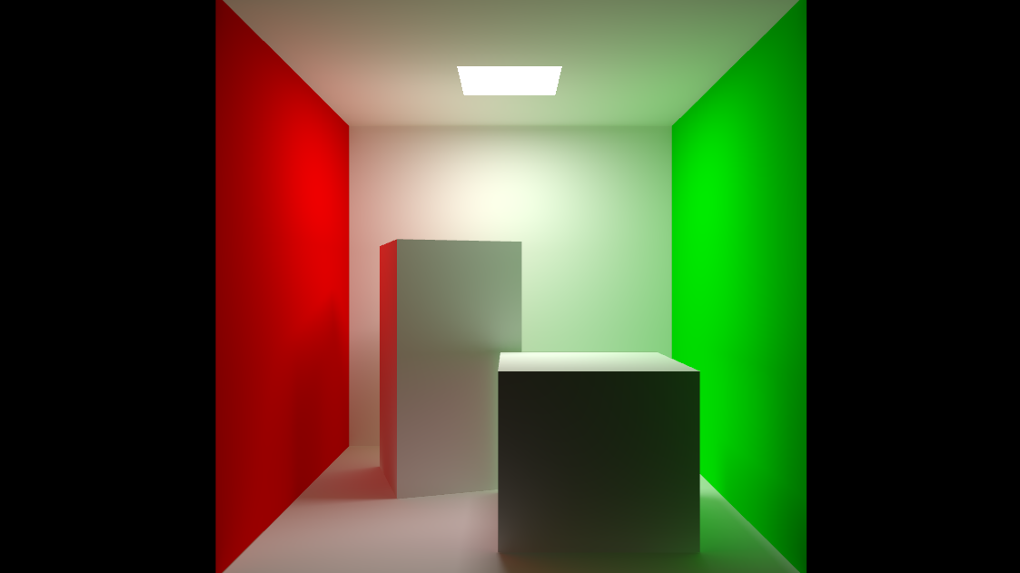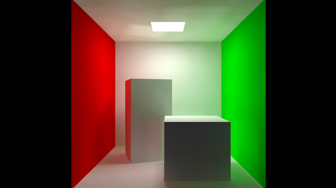 The scene used for the screenshot does not include any light in the scene, the whole lighting is calculated by the GI using the emissive property of the rectangle on the top of the box and ambient occlusion texture: