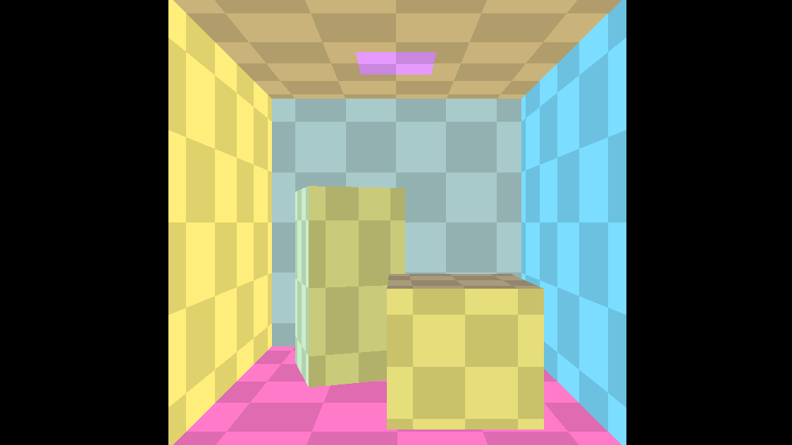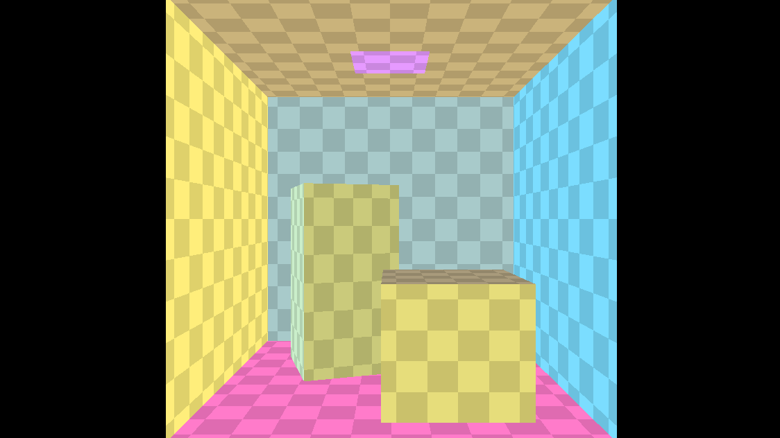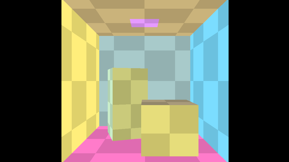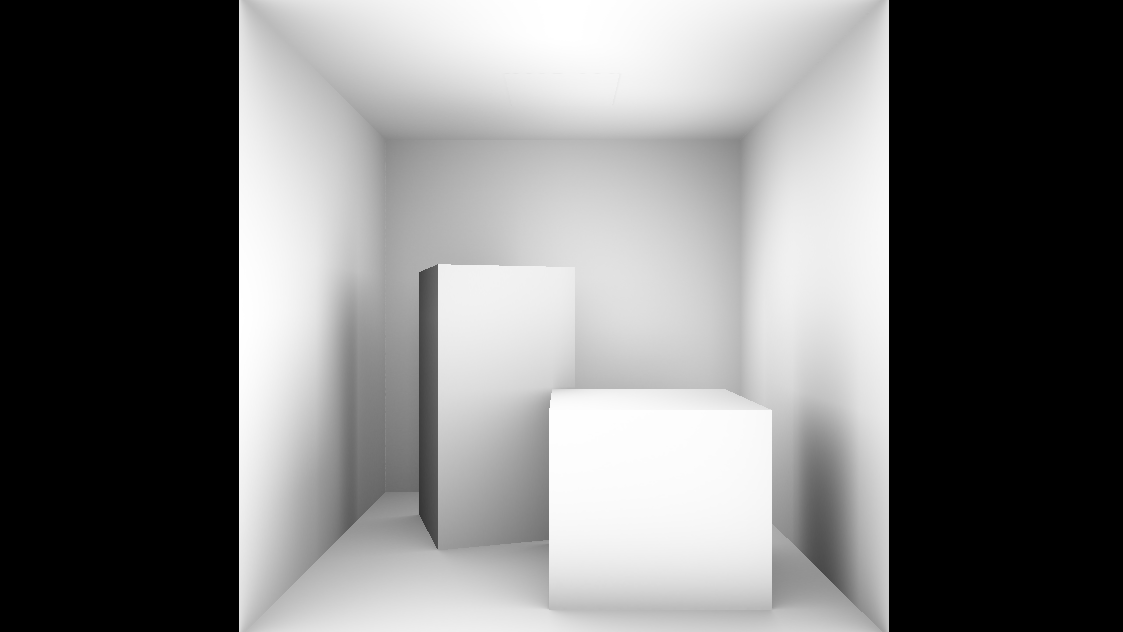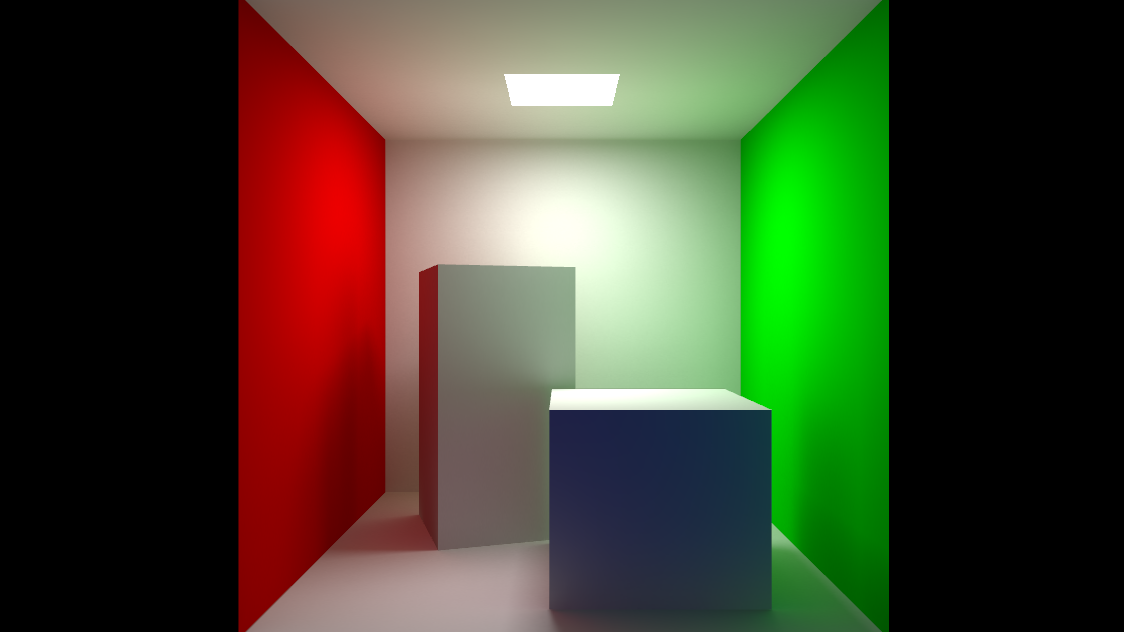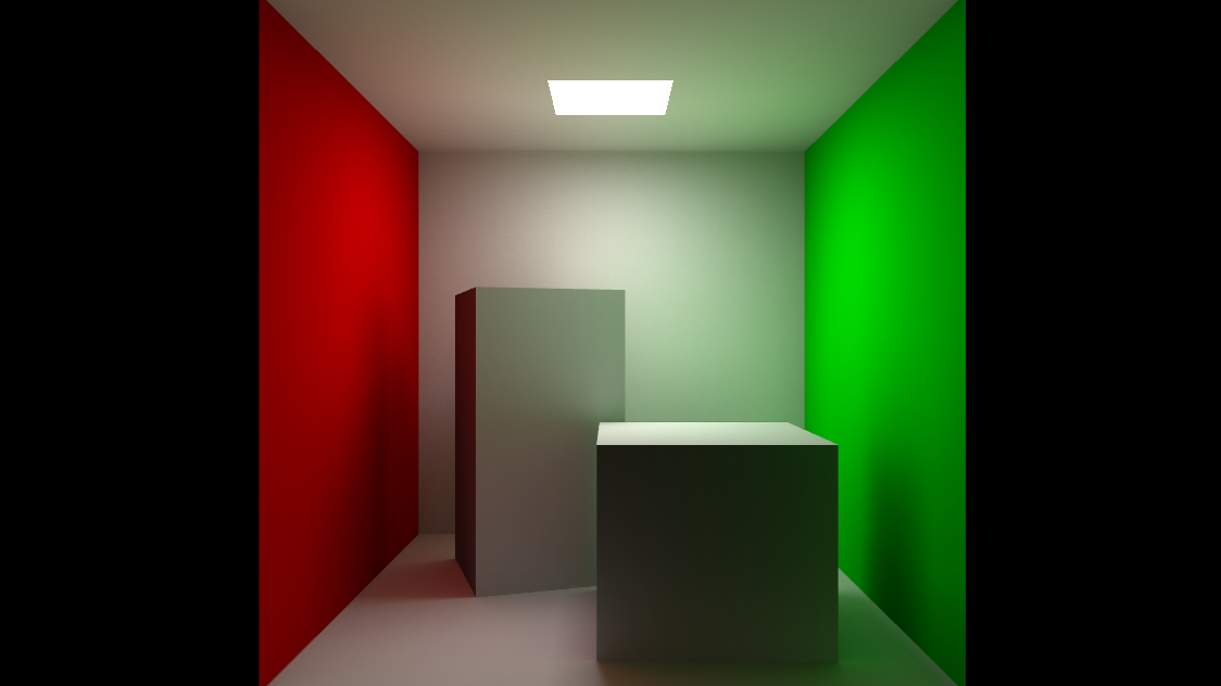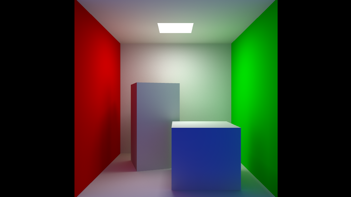 The scene used for the screenshot does not include any light in the scene, the whole lighting is calculated by the GI using the emissive property of the rectangle on the top of the box and ambient occlusion texture: