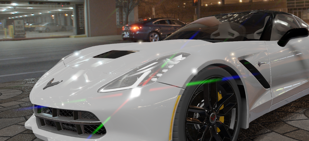 The Light Glares effect is used to simulate how eyes and camera lenses perceive bright spots (direct, reflected sunlight or artificial light) such as car headlamps at night. Light glares can be enabled in the Lens Effects of the Scene Settings. The more emissive a material is, the more intense the effect is. Light Glares work best in combination with blooming effects.