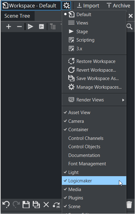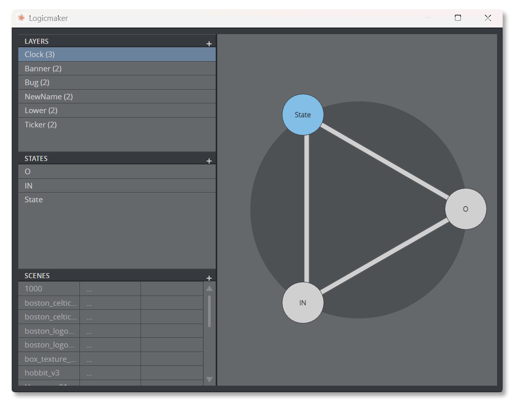Logicmaker is a tool for creating and simulating Transition Logic scenes. Launch by selecting the Logicmaker dock under the list of available Docks. This starts Logicmaker in a floating dock.