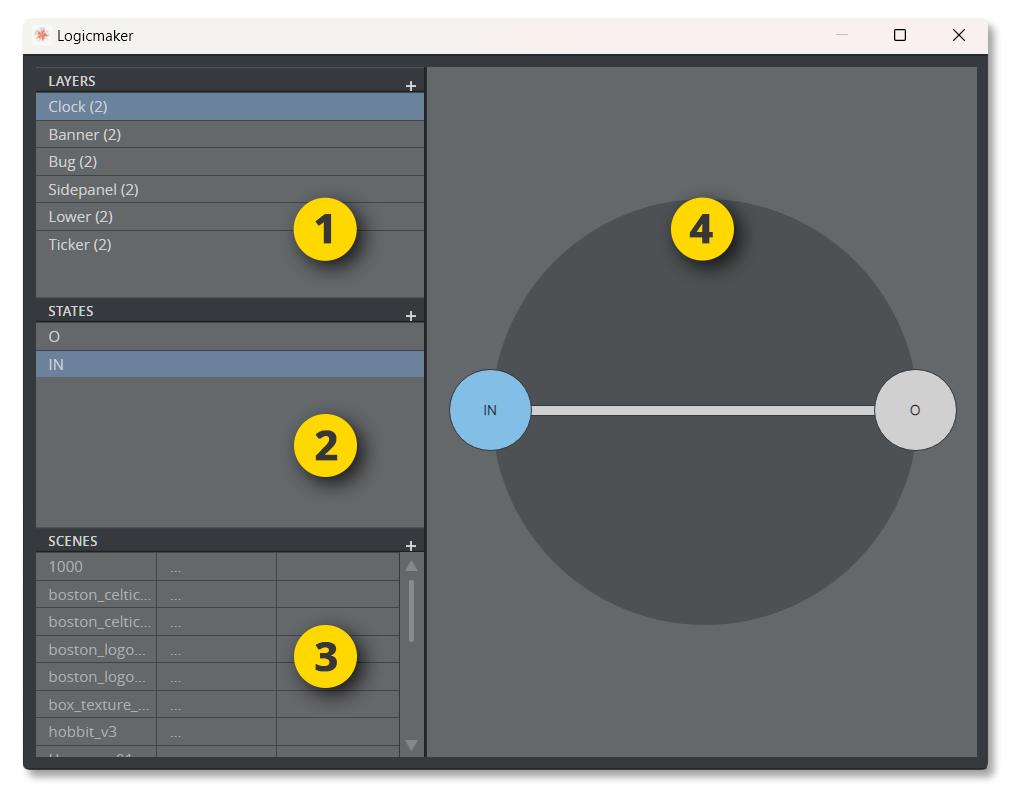 The Scenes List displays a list of all scenes within the same folder as your master scene. It shows the scene name, the layer and the state this scene is attached to.
