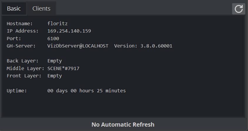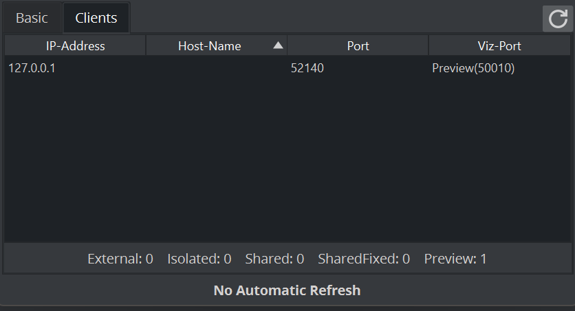 In the Clients Tab, all connected clients are shown, with the IP address, Hostname and Viz Port.