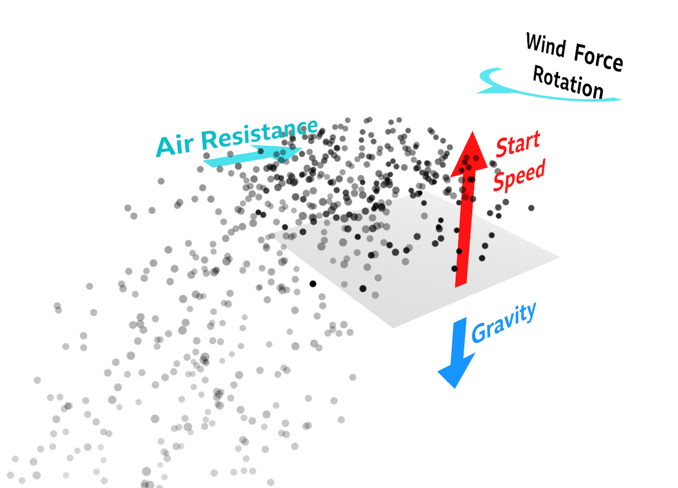 Start speed and the spread modifier (+ / -) defines the initial speed. This force is controlled by Gravity, Air Resistance and the Wind Force.