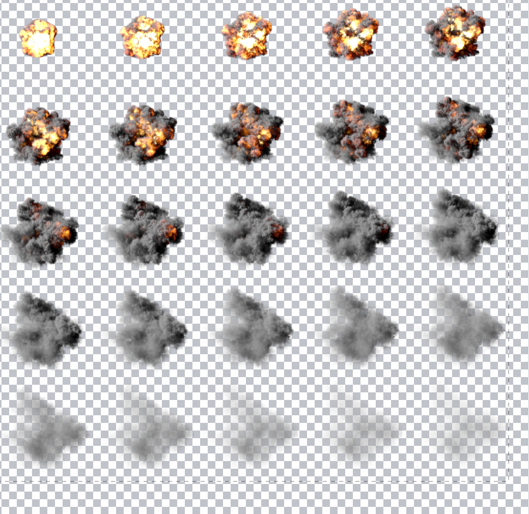 Particles require a texture to look good. These textures can be static RGBA images or tile sequences. (for example, explosions or smoke). Sequences should be in RGBA format and tiled. The sample below shows a 5x5 tile explosion animation. The number of particles on such an animation can be kept quite low (for example, about 20 particles), just a bit of turbulence and x rotation is needed.