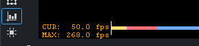 MAX (Maximum): Shows how many frames per second the scene can render at without waiting for vertical retrace. The higher the maximum value, the more performance is left. If the maximum value is reduced to below 50 or 60, the scene is not rendering in real-time.