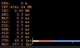 ANI (Animation): Shows how many milliseconds all active directors and animation channels take. This indicator is linked to the yellow bar.