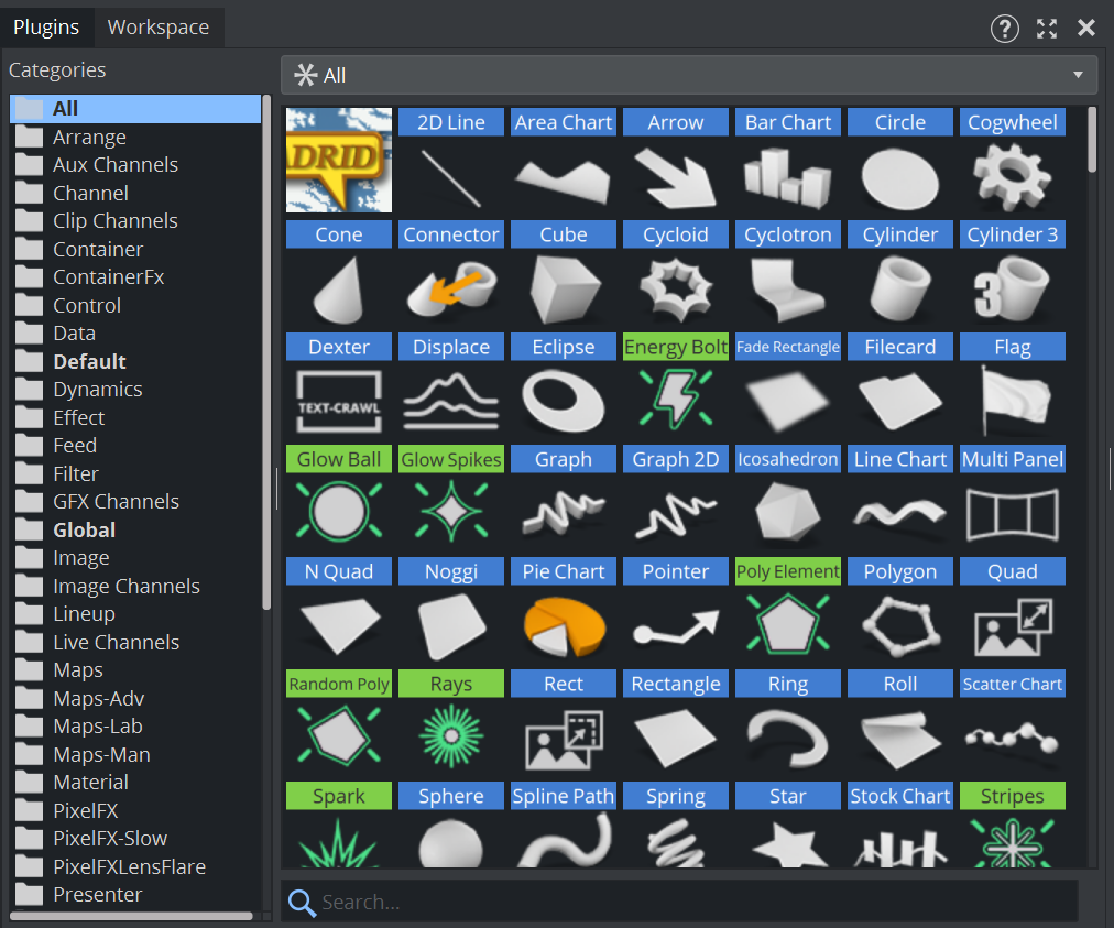 The search field on the bottom of the Plugin panel allows to do a free text search for all kind of plug-ins. For example, if you want to add a Rectangle plug-in, simply start typing Rect and only plug-ins with rect in their name are displayed.