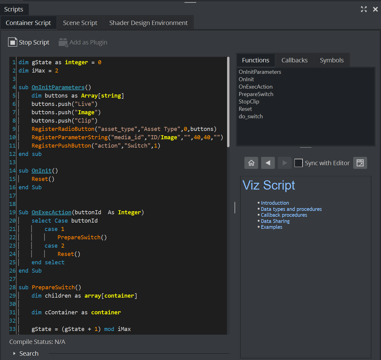In the Scene Script panel, you can add and edit scripts which are part of a Scene (see Script Editor). Those scripts act as a global script responding for the whole scene whereas Container Script usually only act on Container Level.