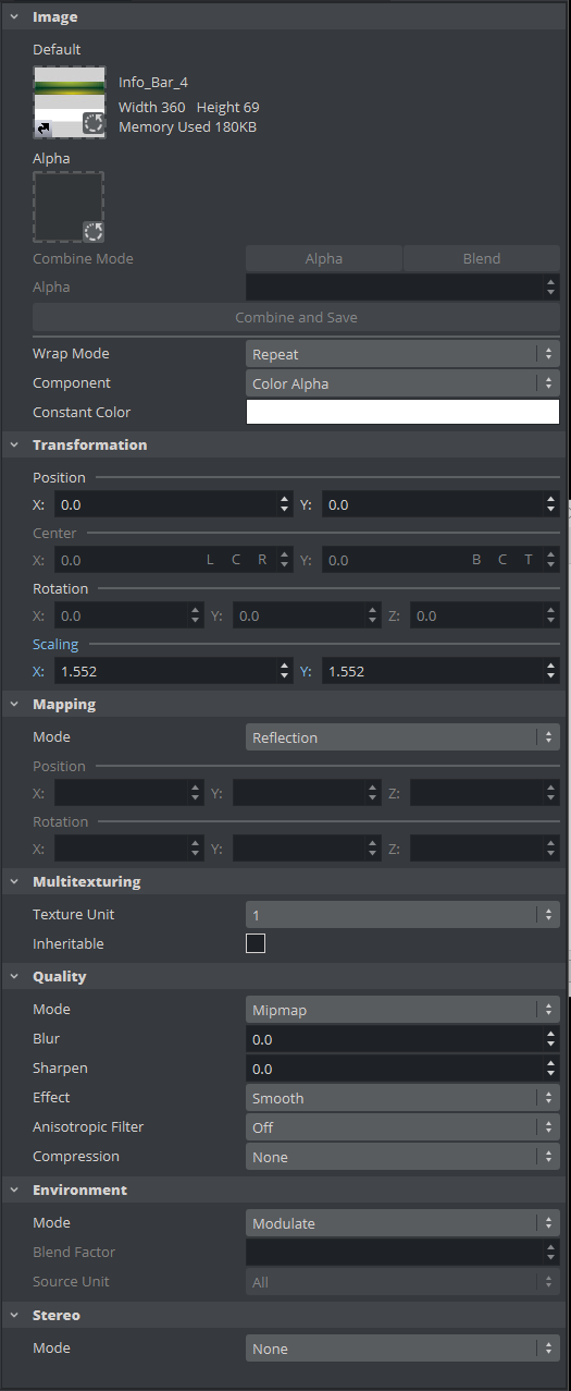 Combine Mode: The second image can be used either as an Alpha channel or it can be blended into Texture (1).