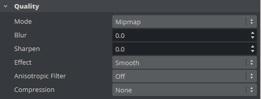 Mipmap: Performs a linear interpolation to smooth the texture. In addition, it offers a solution to the problem that shows on the two other qualities when the object is being moved away along the Z axis or shrunk. To avoid the “noise” that we see when a texture constantly scales to try to fit onto a shrinking/magnifying, the mipmap quality creates a set of prefiltered images in a decreasing scale down to almost on pixel. These are used as the object scales up and down and a more static look of the texture is thereby achieved. Mipmap quality absorbs more memory performance than the two other qualities.