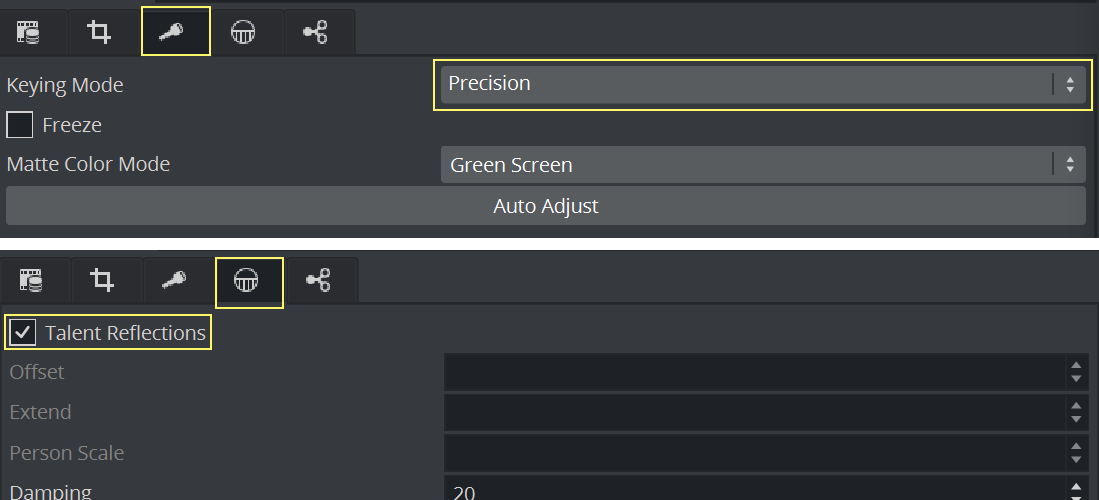 • The important settings are the Reflection Texture, this is the one the Precision Keyer is using and the Reflection Container, this is the container that holds the detected person position. Please use the Screenspace Reflection option (the textures for Normal map and Roughness are optional).