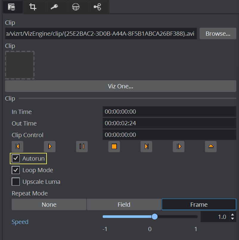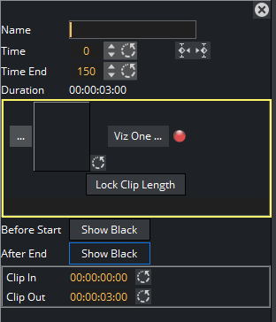 Click Lock Clip Length to specify a certain time/length for your clip. This is useful when loading clips from an external control application via Viz One. In this case, the lock clip length acts as a placeholder, but does not change the clip length automatically after loading.