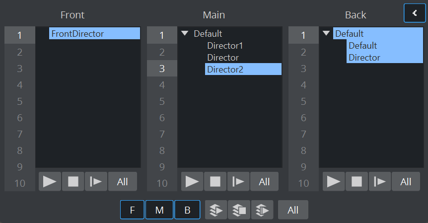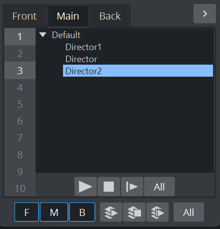 Back: Lists the directors belonging to the back layer scene. This button is only enabled if a back layer has been defined in the Layer Manager.